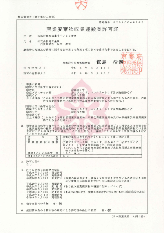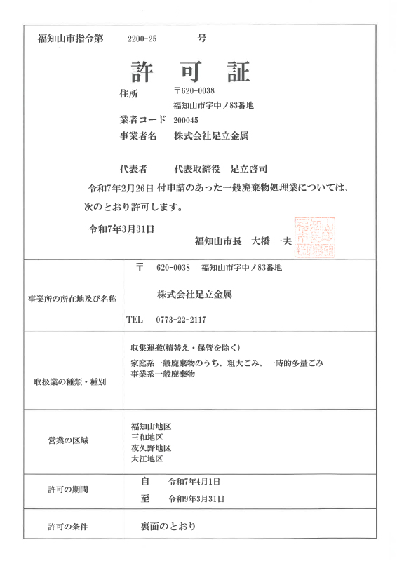 | 一般廃棄物処理 | 収集運搬(積替え・保管を除く) 家庭系一般廃棄物のうち、粗大ごみ、一時的多量ごみ 事業系一般廃棄物 | 福知山地区 三和地区 夜久野地区 大江地区 |