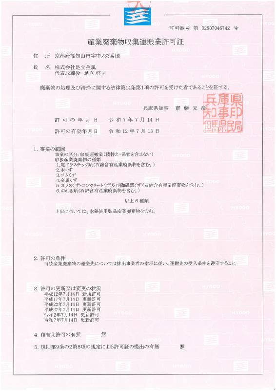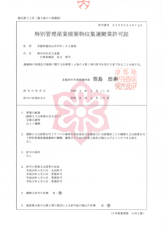 | 特別管理 産業廃棄物 収集運搬 | 許可番号 | 02650046742 | - | - | - |