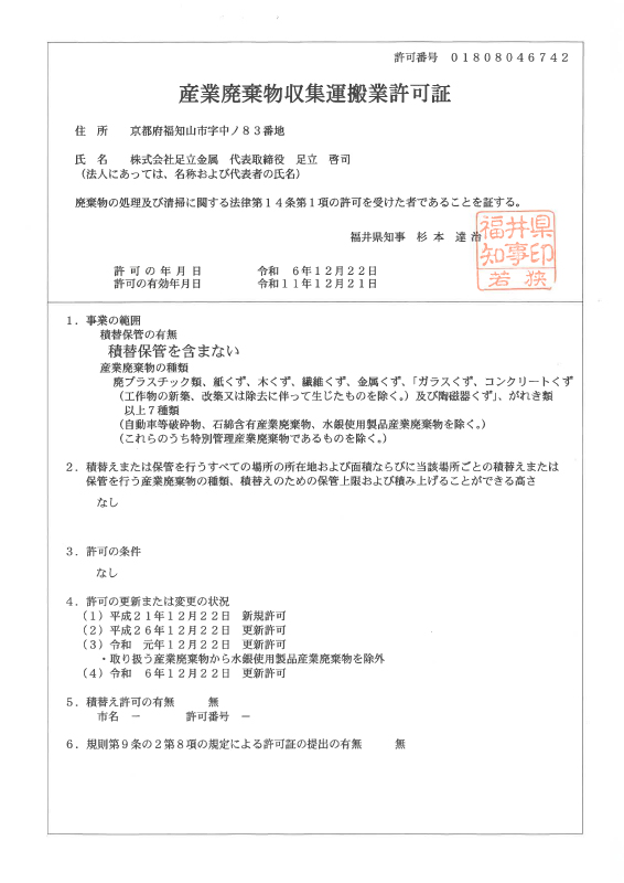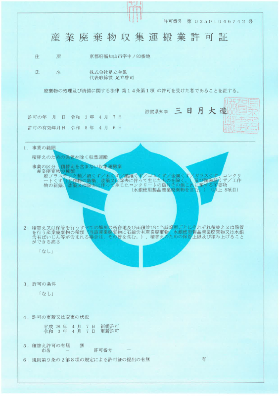 | 産業廃棄物 収取運搬 | 許可番号 | 02610046742 | 02807046742 | 01808046742 | 02501046742 |